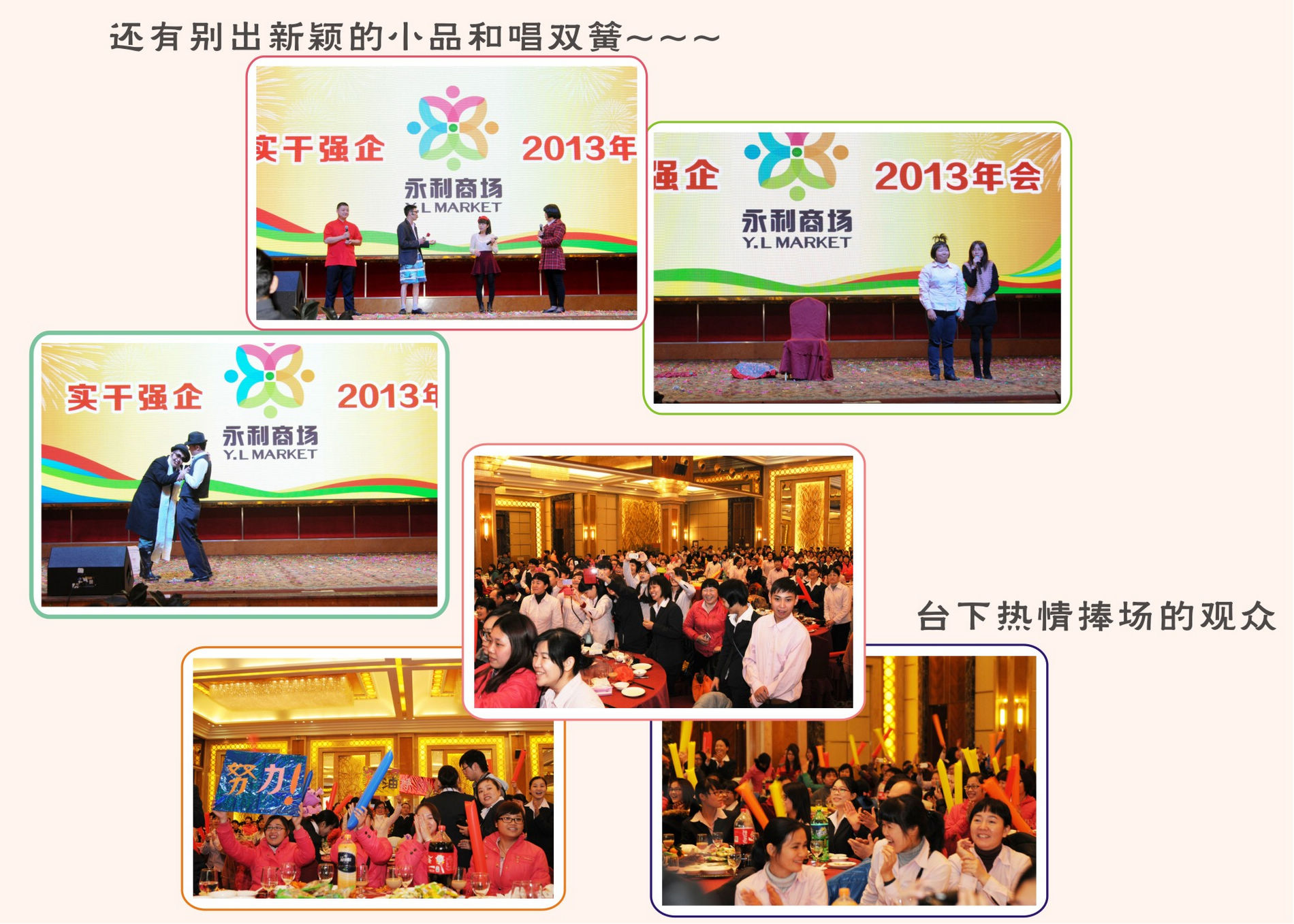 2014年1月9日全体永利人欢聚在江门金凯悦大酒店举行2013年度员工大会。在年度大会上,总经理王亚成围绕年会主题发表了只有实干方能强企的重要讲话,紧接着副总经理谢杰周总结了2013年公司的成功扩展和各门店的创造的优异成绩,同时还明确了2014年实干强企的发展方向。