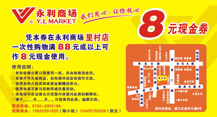 永利商场为提高里村店的知名度,特意举行推广宣传活动。活动期间,顾客凭永利商场派送的优惠券在里村店一次性购物满88元以上可作8元现金使用。
